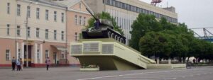 Танк Т-34, который возвышается на бетонном постаменте – это памятник возведённый в честь воинов-освободителей города. Он был установлен в 1968 в память об освобождении города от немецко-фашистских захватчиков 26.11.1943 (архитектор В. Холодов).